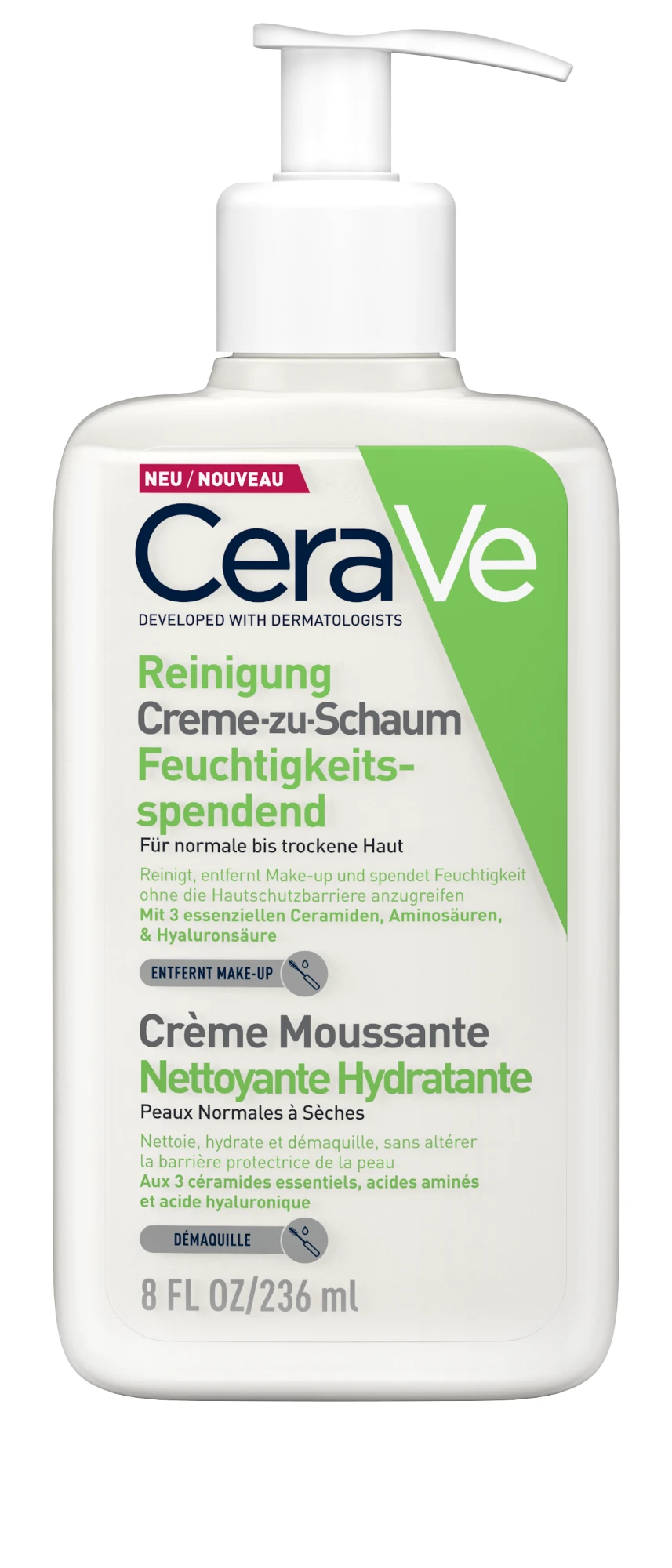 ACTIVE INGREDIENTS: This gentle cleanser is enriched with 3 essential ceramides, Amino Acids and Hyaluronic Acid. Formulated with CeraVe’s patented MVE Technology locks in moisture giving continuous hydration for up to 24 hours. Developed with dermatologists, CeraVe Hydrating Cream-to-Foam Cleanser is a rich cream that transforms into a lathering foam to gently, yet efficiently cleanse and remove makeup, while hydrating without disrupting the protective skin barrier. Suitable for normal to dry skin.