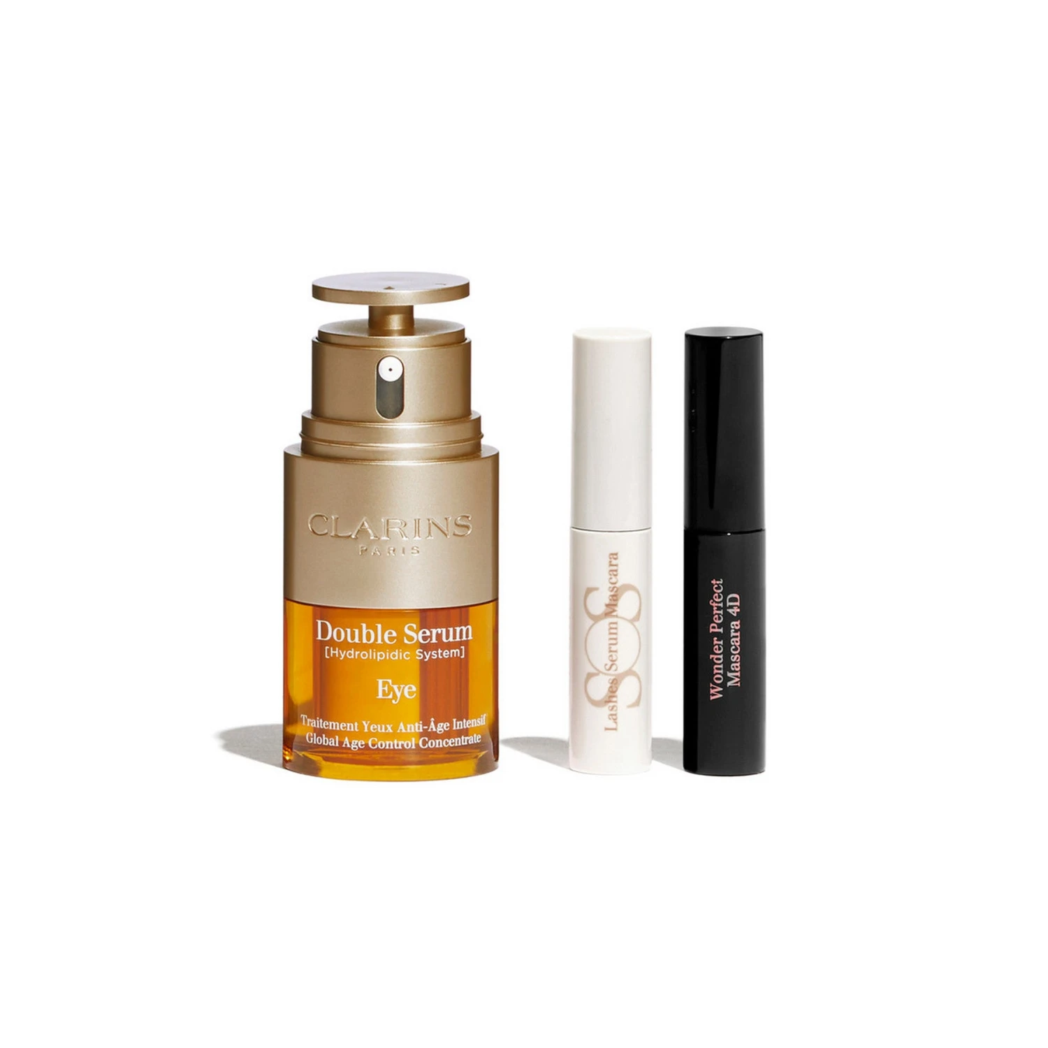 This set combines three skincare and make-up essentials for a perfect eye look. Double Serum Eye targets the visible signs of ageing around the eye area: wrinkles are smoothed, puffiness and dark circles are diminished, and the eyes are brightened. The SOS Lashes Serum Mascara enhances and strengthens the lashes and the Wonder Perfect 4D Mascara makes them beautiful and long for an intense look. A large pouch holds all these products.
