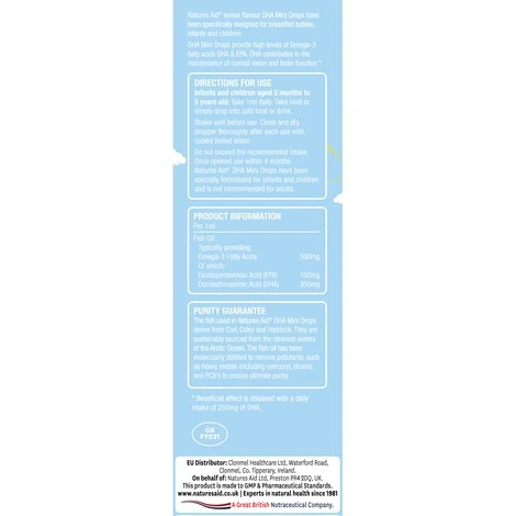 Natures Aid® lemon flavour DHA drops have been specifically designed for breastfed babies, infants and children. DHA drops provide high levels of Omega-3 fatty acids DHA & EPA.