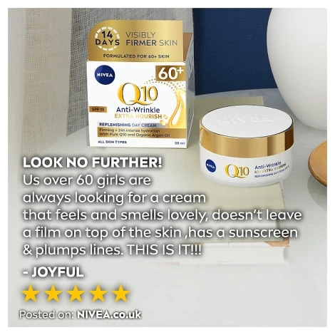 NIVEA Q10 Anti-Wrinkle Extra Nourish 60+ Replenishing Day cream SPF 15 – 14 days to visibly firmer skin.
