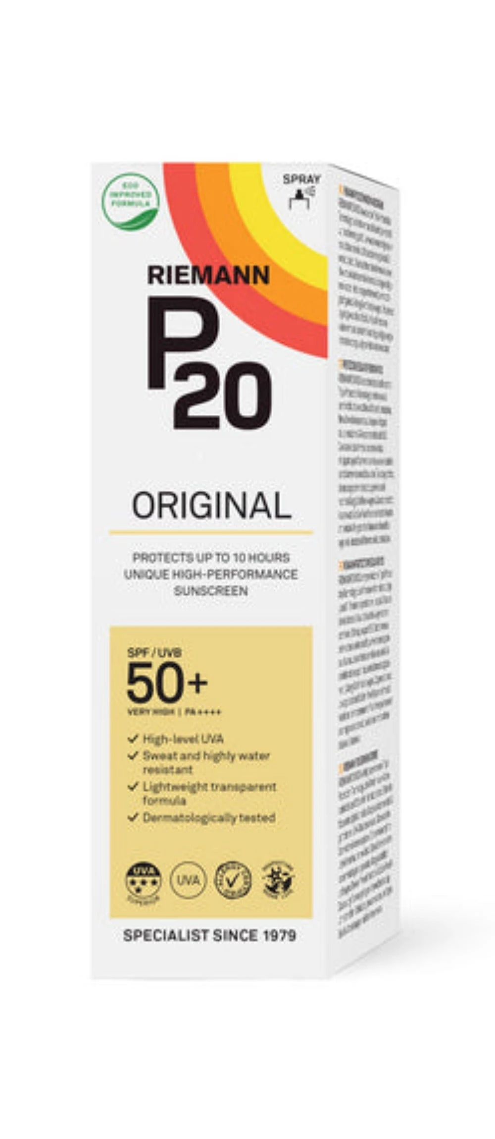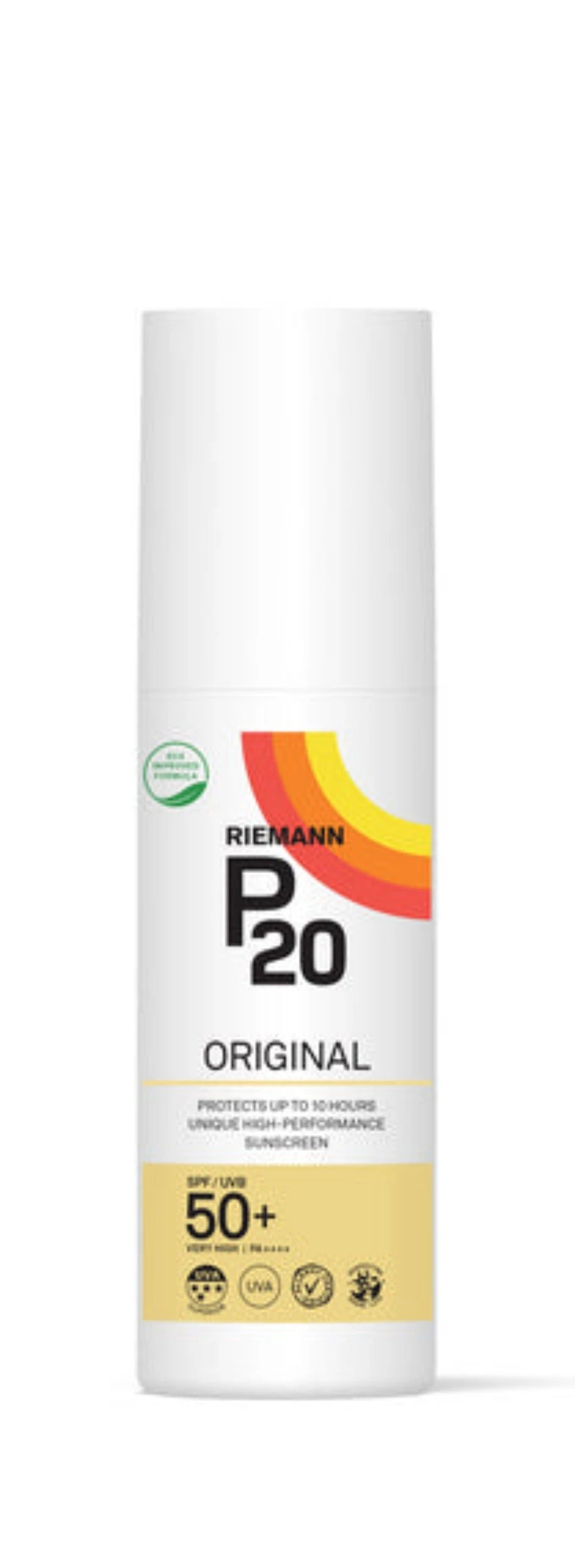 Riemann Original Spray SPF 50+ provides up to 10 hours of protection with its Triple Protection Technology. The sunscreen is water resistant, sweat resistant and exceeds EU’s required level of UVA protection. A lightweight, transparent spray that is easy to apply. Riemann P20 ORIGINAL is dermatologically tested, allergy certified, fragrance free and vegan. A sunscreen for those who require high-performance protection.