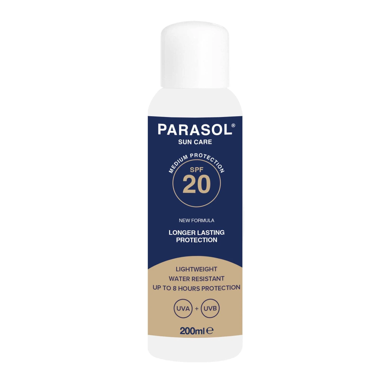 Parasol Sun Care Long Lasting Suncream SPF20. This lightweight formula provides longer lasting protection aginst UVA and UVB. Water resistant and sutable for sensitive and fair skin.