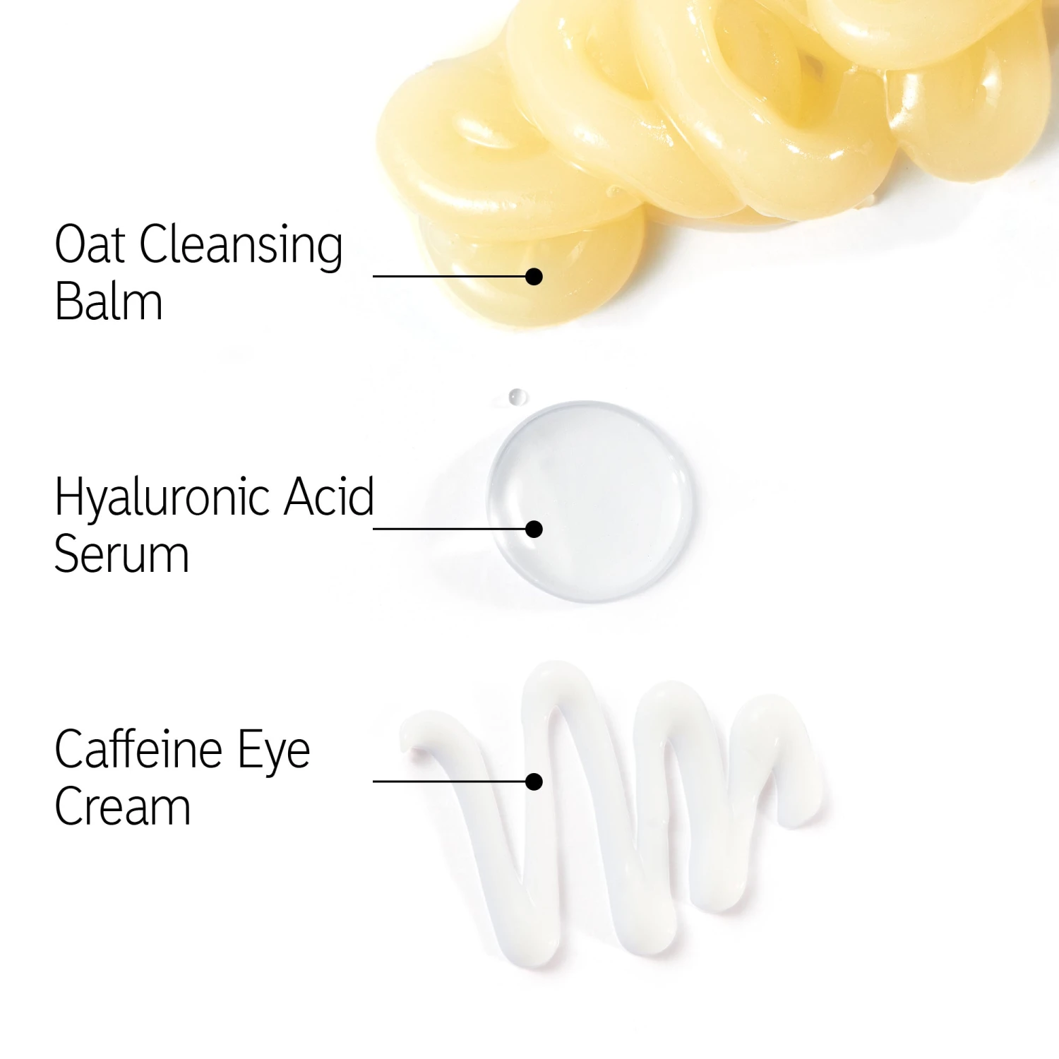 - Oat Cleansing Balm 150ml: A rich cleanser that leaves skin feeling hydrated and clarified. The deeply nourishing formula features colloidal oatmeal and oat kernel oil to effortlessly melt away makeup and impurities, while delivering soothing benefits. Dry skin feels revived and replenished with moisture.