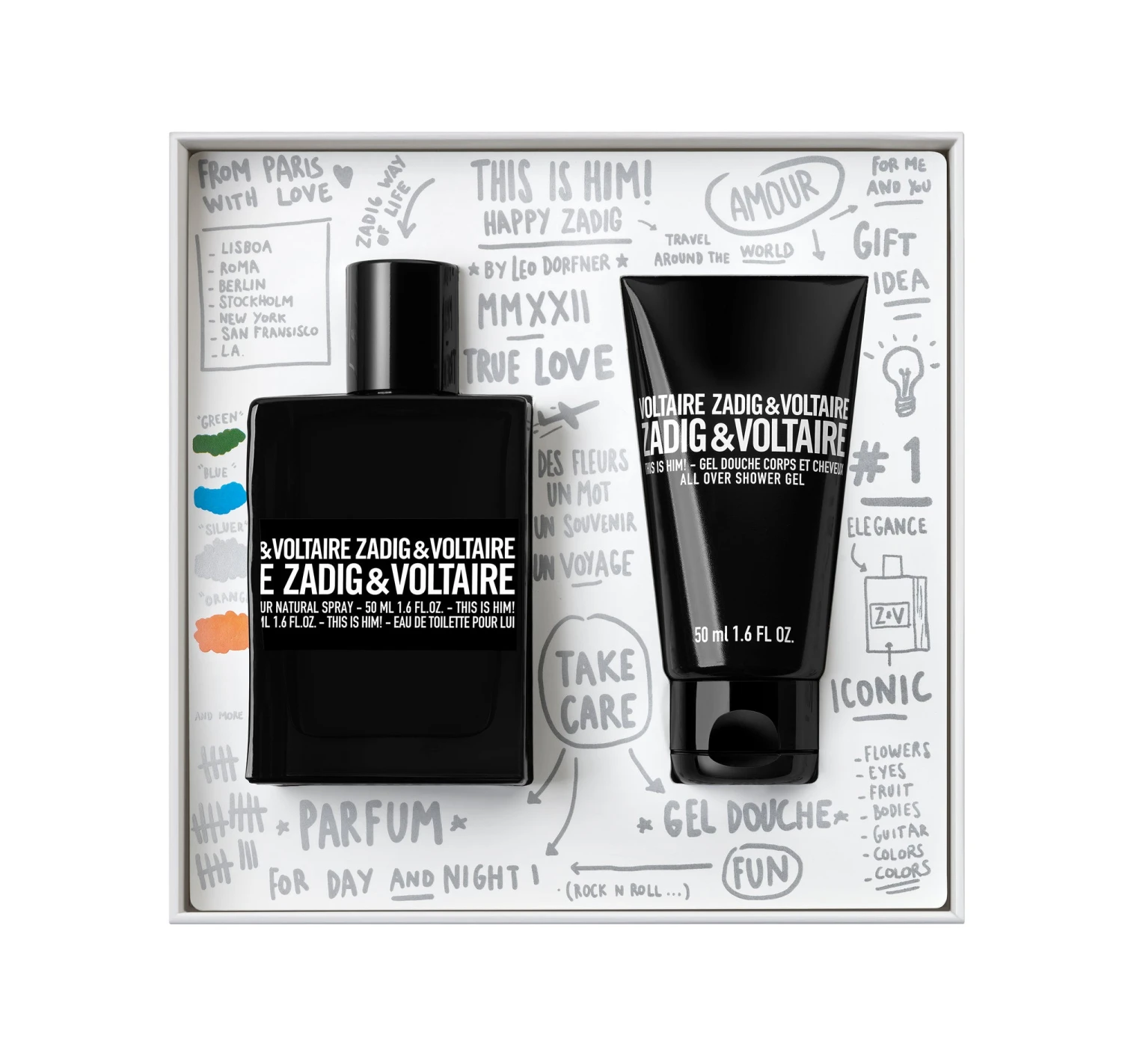The THIS IS HIM! fragrance is the epitome of a rock “n” roll gentleman with an assured style. This urban adventurer emphasises his confidence with spicy incense, grapefruit and black pepper. A manly heart note reveals itself with a duo of vanilla and incense. A free spirit, a wild instinct: the resolutely rock trail is underlined by Zadig&Voltaire’s signature sandalwood.